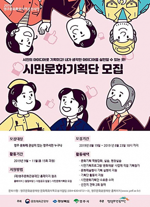영주시는 영주문화관광재단(이사장 장욱현)이 추진하고 있는 영주문화특화지역 조성사업을 함께 할 다양한 경험과 아이디어를 가진 시민문화기획단을 모집한다.