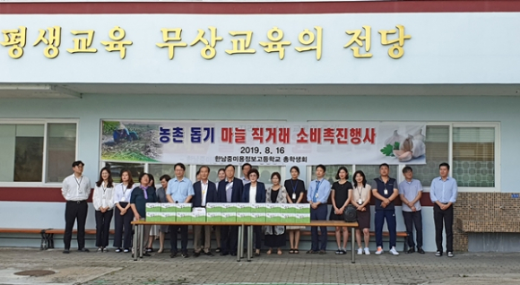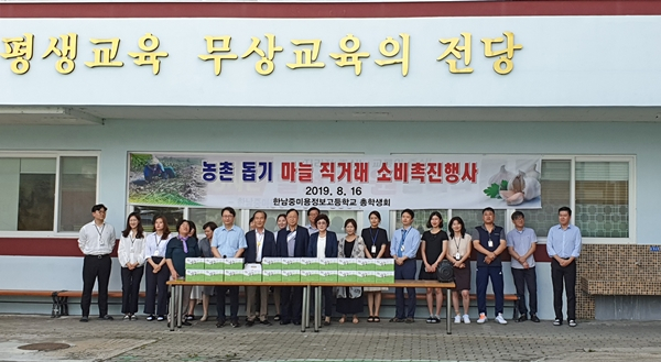 한남중미용정보고등학교(교장 윤근수)는 8월 16일 오후 학교 운동장에서 '농촌돕기 마늘직거래 소비촉진행사'를 가겼다.