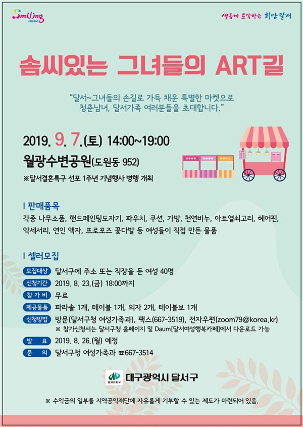 대구 달서구(구청장 이태훈)는 8월 23일까지 여성들의 수공예품 판매 프리마켓인 ‘솜씨있는 그녀들의 ART길’에 참여할 셀러를 모집한다고 밝혔다.