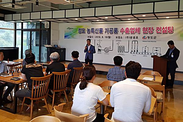 청도군(군수 이승율)은 지난 8월 19일 ㈜생생초 회의실에서 농산물 가공식품 수출 확대를 위한 가공업체(농가)에 대한 현장 컨설팅을 개최했다.