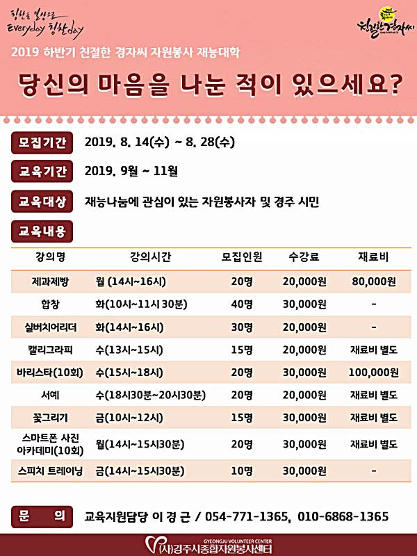 (사)경주시종합자원봉사센터(이사장 조문호)는 8월 28일까지 ‘2019 하반기 자원봉사 재능대학’ 수강생을 모집한다.