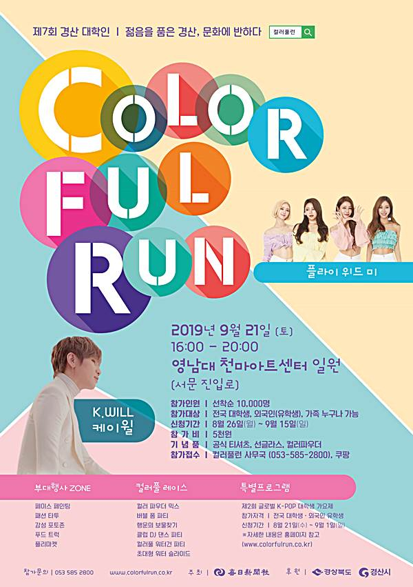 4차 산업혁명을 선도하는 젊은 교육 도시 경산에서 ‘제7회 경산 대학인 Colorful Run’ 축제가 9월 21일 16시부터 영남대에서 개최된다.