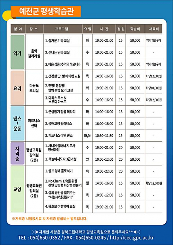 예천군(군수 김학동)에서는 오는 9월 4일부터 예천군 평생학습관 교육 프로그램을 운영한다.