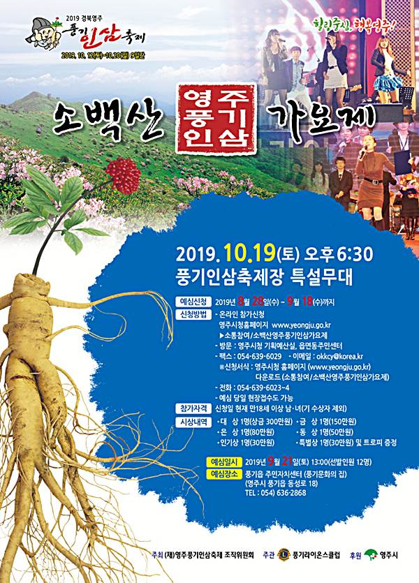 경북 영주시는 지역 대표 가요제 ‘2019 소백산 영주풍기인삼가요제’ 참가신청을 8월 28일부터 9월 18일까지 접수한다.