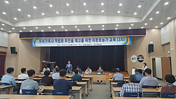 청도군(군수 이승율)은 지난 8월 26일 무허가 축사 적법화 추진율 제고를 위하여 미완료 농가를 대상으로 현재 추진상황을 점검하고 적법화 지도 및 3차 교육을 실시했다.