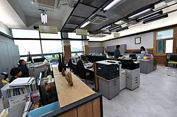 주요 개선내용으로는 노출형 천정, 친환경적 벽체 및 카페 분위기의 조명기구 설치 등으로 사무환경을 크게 개선했다. [시군향우회인터넷뉴스=정미진기자]