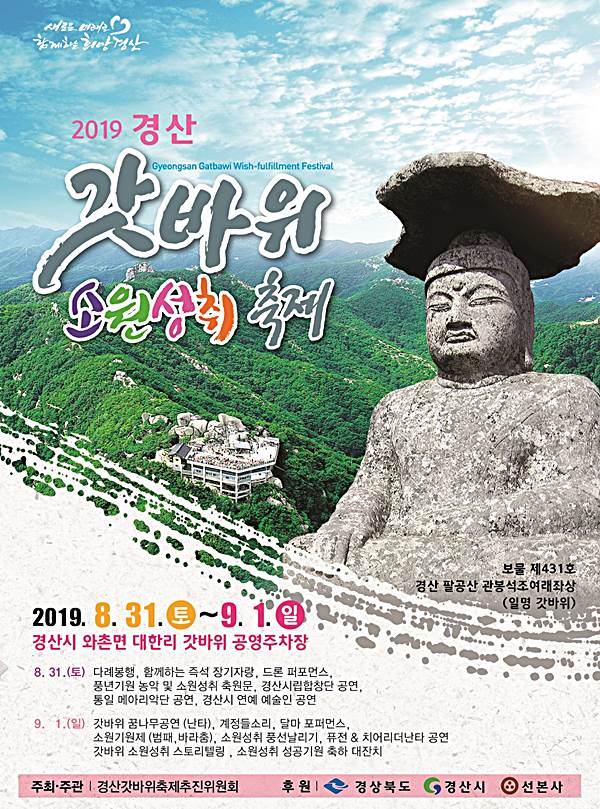 평생 한 가지 소원은 꼭 이루어준다는 보물 제431호 ‘경산 팔공산 관봉석조여래좌상’의 영험한 기운을 모태로 매년 열리는 경산갓바위 소원성취 축제가 오는 8월 31일에서 9월 1일까지 2일간 경산시 와촌면 갓바위 공영주차장 일원에서 열린다.