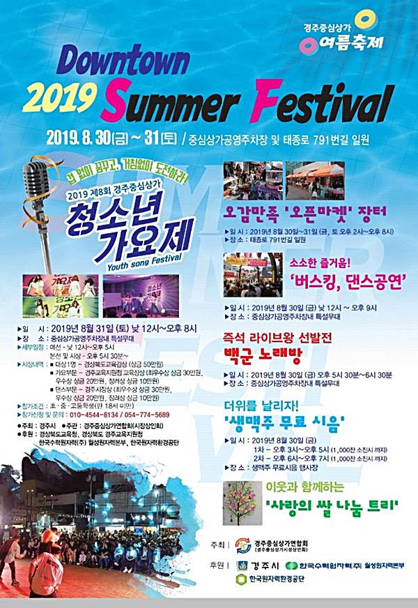 경주시는 8월 30일부터 31일까지 양일간 경주중심상가 공영주차장(황오동 244번지) 일원에서 ‘2019 경주중심상가 여름축제’가 개최된다고 밝혔다.