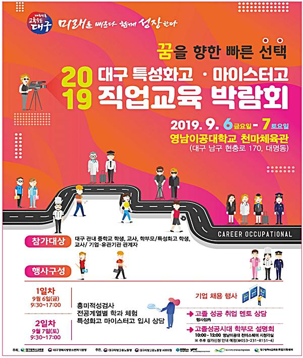대구시교육청(교육감 강은희)은 ‘2019 대구 특성화고·마이스터고 직업교육박람회’를 오는 9월 6일부터 7일까지 이틀에 걸쳐 영남이공대학교 천마체육관에서 개최한다.