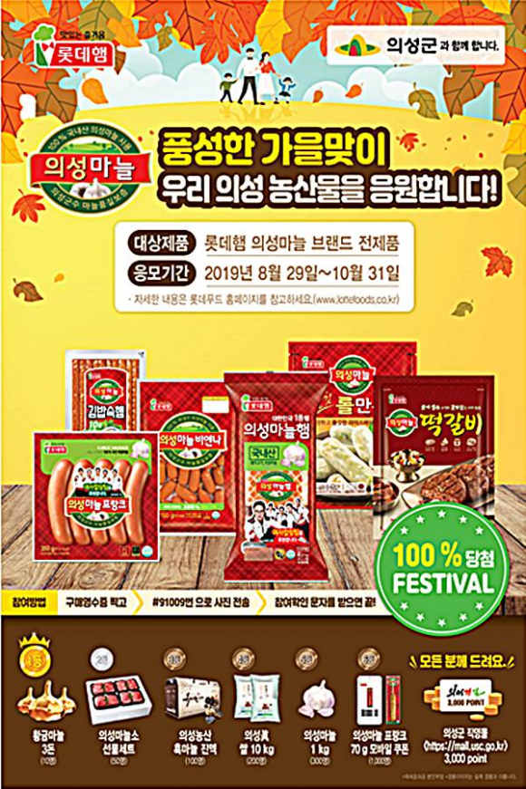 ‘롯데햄 의성마늘 브랜드가 의성농산물을 응원합니다’ 이벤트는 롯데푸드에서 주최하고 의성군 대표 농특산물 쇼핑몰 ‘의성장날’에서 협업하며 오는 10월 31일까지 진행한다.