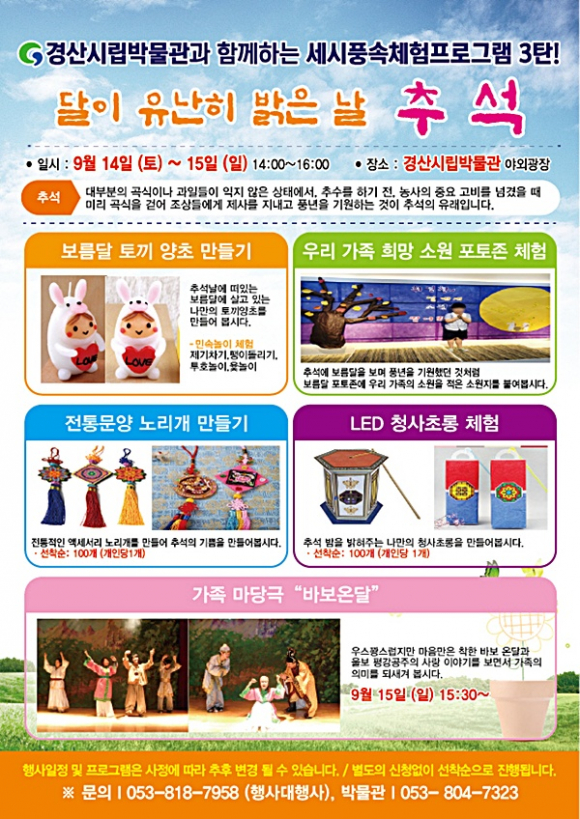추석의 세시풍속에 대한 이해와 전통놀이 체험의 기회를 제공하기 위하여 준비된 이번 행사에서는 토끼 모양 양초 만들기, LED 청사초롱 체험, 우리 가족 소원지 쓰기, 전통문양 노리개 만들기 등을 무료로 체험할 수 있으며, 15일 일요일에는 가족 마당극 ‘바보온달’ 공연도 예정되어 있다.