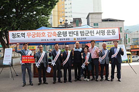 청도군의회는 지난 2월 15일 제254회 임시회 제1차 본회의에서 의원전원 발의한 ‘무궁화호 열차운행 감축에 따른 대정부 건의안’을 만장일치로 채택했으며, 지난 6월 14일에는 박기호 의장을 비롯한 의원 5명이 청도군 기획예산담당관과 함께 한국철도공사를 방문하여 감축 철회를 강력히 요구했다.