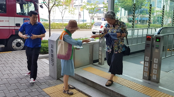 | ↑↑ 남구 지역자율방재단이 교대역 2번 출구 앞에서 지진안전캠페인을 하고있다 . |