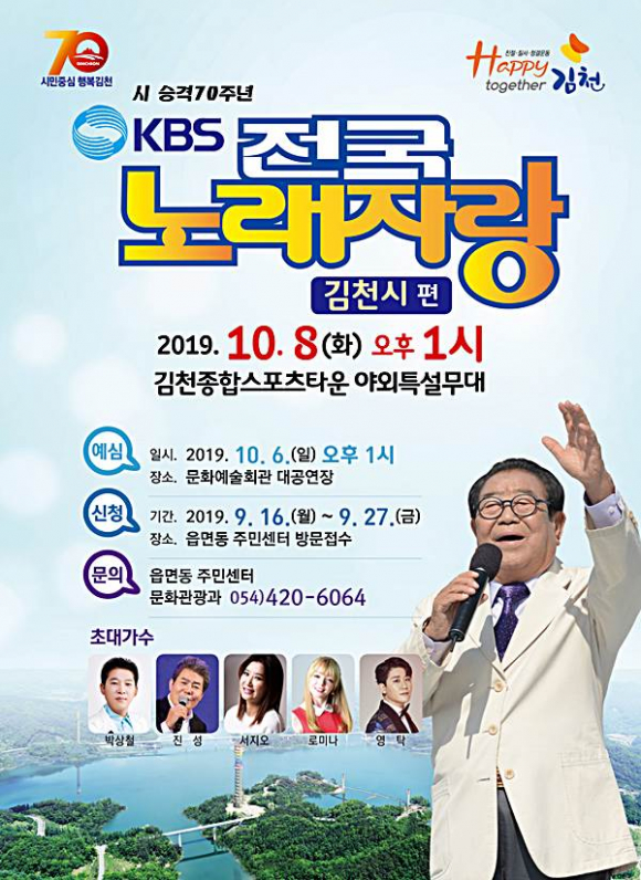 온 국민의 사랑을 받고 있는 ‘KBS 전국노래자랑’이 시 승격 70주년을 맞이하여 10월 8일 오후 1시 김천종합스포츠타운 야외특설무대에서 본선 녹화공연이 열린다.