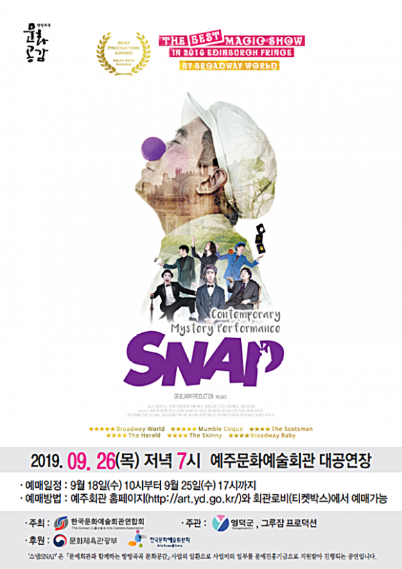 ‘스냅’은 지난 2016년 초연을 시작으로 영국 에든버러 프린지 페스티벌 등 다양한 국내·외 예술제에서 공연했으며, 세계적인 평론지 브로드웨이 월드가 선정한 최우수 공연, 아시안 아츠아워드 ‘베스트 프로덕션’상을 수상하는 등 마술의 장르적 한계를 뛰어 넘는 예술성과 작품성으로 평론가들과 관객들의 호평을 받고 있는 대한민국 창작극이다.