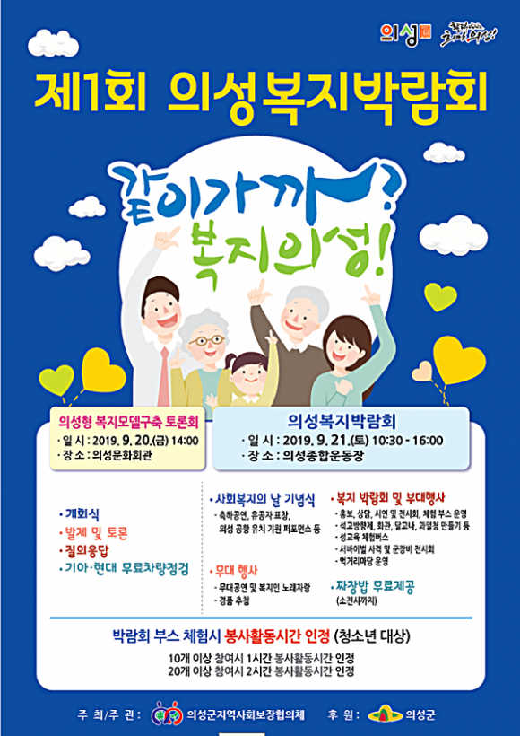 의성군(군수 김주수)은 오는 9월 20일과 21일 이틀간, 의성종합운동장 일원에서 의성군지역사회보장협의체 주관으로 ‘제1회 의성복지박람회’가 열린다고 밝혔다.