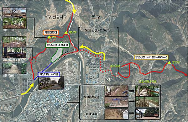 이런 불편을 해소하기 위해 북구청은 금호강누리길 조성사업의 지속추진을 위하여 2017년부터 매년 국토교통부 주민지원사업에 공모하였으며, 올해 선정되어 사업비 8억 8천만원(국비 90%, 구비 10%)이 확보됐다.