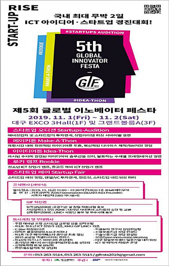 올해로 5회째를 맞이하는 글로벌 이노베이터 페스타(GIF)는 대구시가 주최하고 (재)대구디지털산업진흥원이 주관하는 대구의 대표 창업행사다.