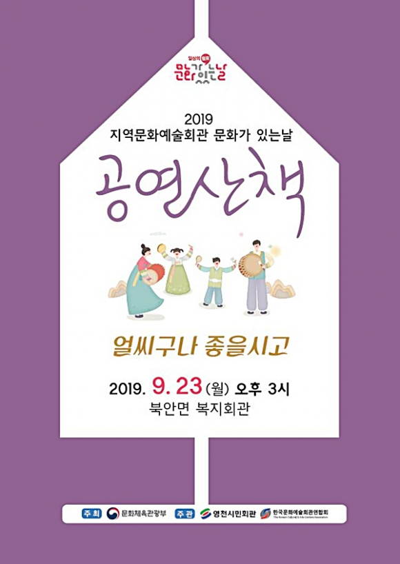 영천시민회관에서는 오는 9월 23일 오후 3시 북안면복지회관에서 지역민들을 위한 흥겨운 어울림 한마당 ‘얼씨구나 좋을시고’ 공연을 선보인다.