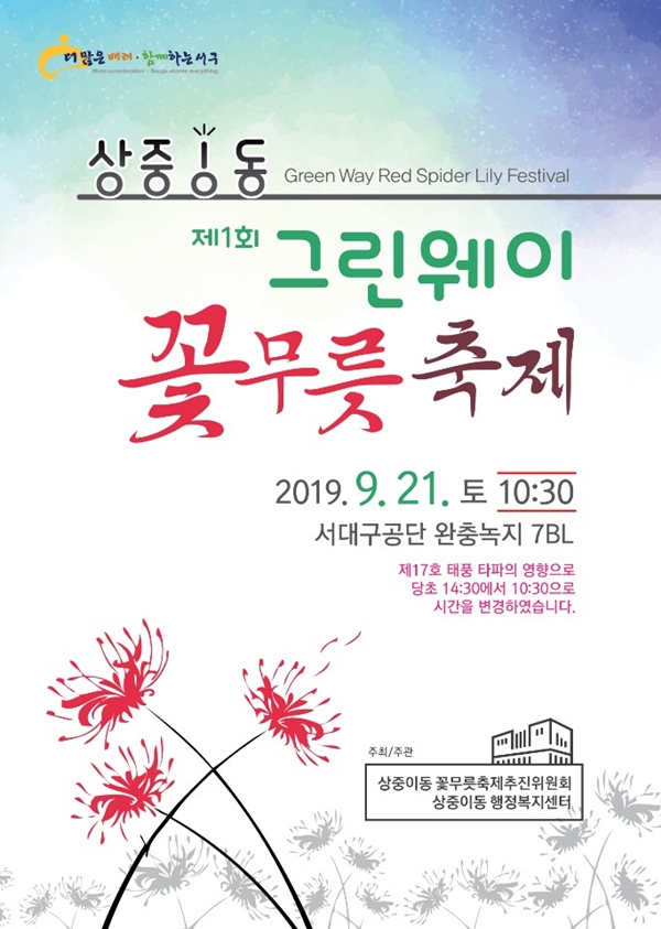 대구 서구 상중이동행정복지센터(동장 김천호)는 오는 9월 21일 오전 10시 30분 서대구공단 완충녹지공원(그린웨이)7BL에서 제1회 그린웨이 꽃무릇 축제를 개최한다.