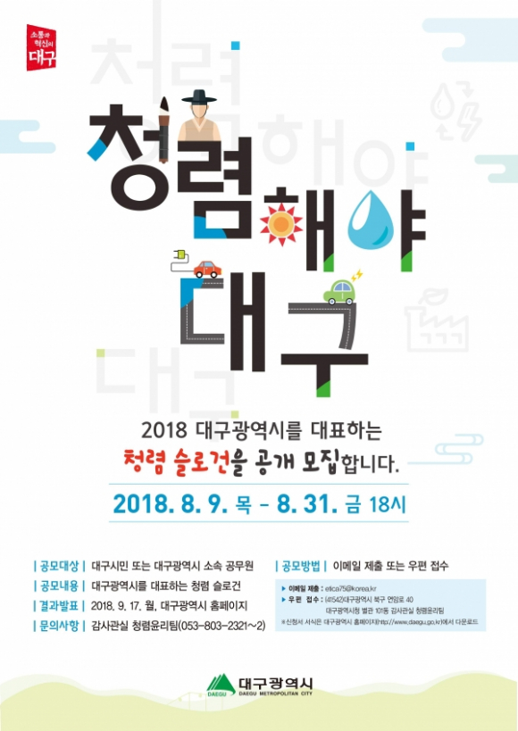 2018. 8. 9.(목) ~ 8. 31.(금) 18:00 까지 일반 시민 또는 대구광역시 소속 공무원을 대상으로 대구광역시를 대표하는 청렴 슬로건(16자 이내의 한글 문구, 띄어쓰기 미포함)을 공모한다.
