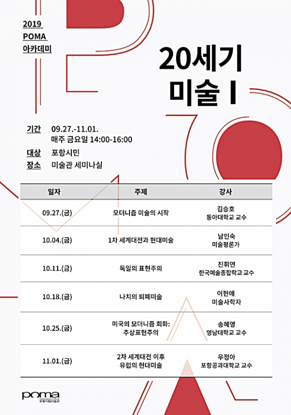 ‘2019 POMA 아카데미’는 9월 27일부터 11월 1일까지 매주 금요일 14시 포항시립미술관 지하 세미나실에서 진행되며, 포항시민이면 누구나 홈페이지(www.poma.kr)를 통해 사전 예약 접수가 가능하다.