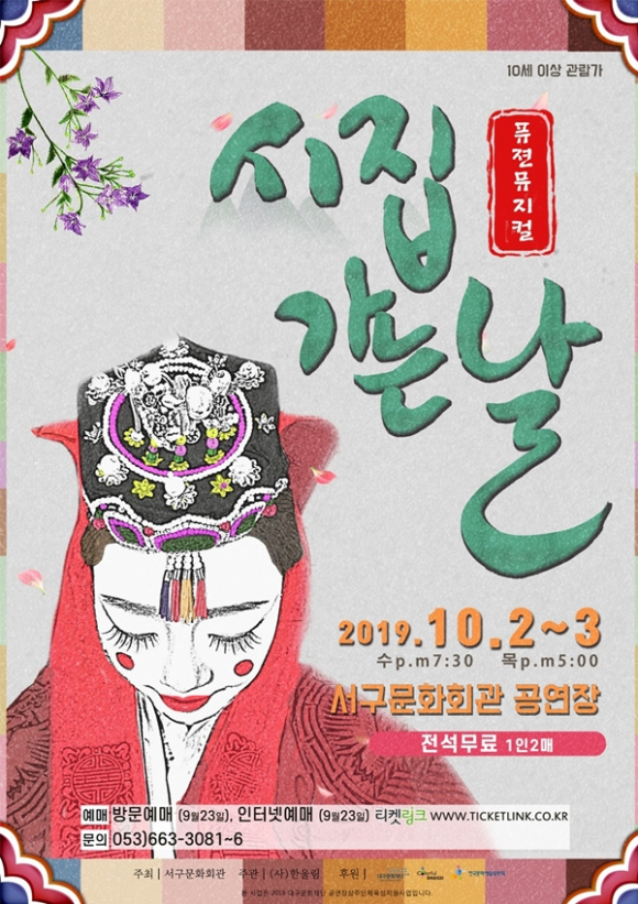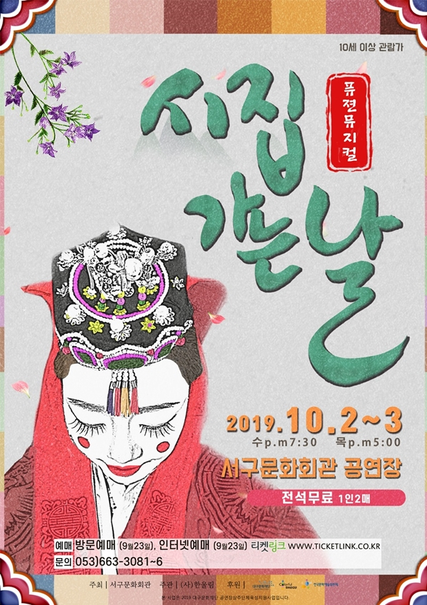 대구 서구문화회관(관장 박원숙)은 오는 10월 2일 19:30, 10월 3일 17:00 이틀에 걸쳐 남녀노소 재미있게 즐길 수 있는 퓨전뮤지컬 ‘시집 가는 날’을 무대에 올린다.
