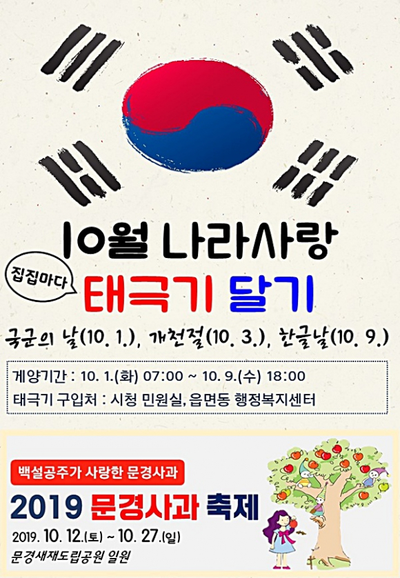지난 제74회 광복절 당시 문경시 전역에 퍼졌던 태극기 물결은 가을이 시작되는 10월 1일 제71주년 국군의 날, 3일 제4351주년 개천절, 9일 573돌 한글날에도 계속 이어진다.