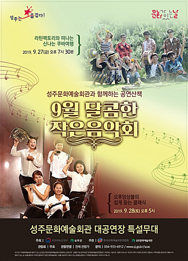 2019 지역문화예술회관 문화가 있는 날 선정작인 ‘달콤한 작은음악회’는 연주자와 관객이 하나 되는 공연이라는 컨셉으로 개최되는 성주문화예술회관 기획공연 프로그램으로 9월 27일에는 대한민국 최고의 라틴음악연주팀인 라틴팩토리의 ‘라틴팩토리와 떠나는 신나는 쿠바여행’이 28일에는 클래식 대중화의 선두주자인 오후앙상블의 ‘오후앙상블의 쉽게 듣는 클래식’이 개최된다.