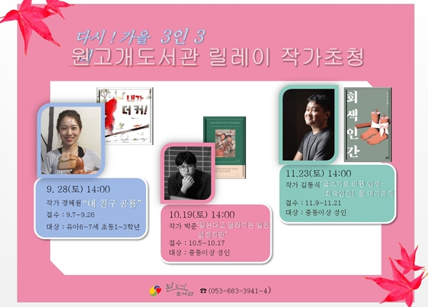 대구 서구청(구청장 류한국) 원고개도서관에서는 9월 독서의 달과 도서관 개관 1주년 행사로 ‘3인 3색 릴레이 작가 강연’행사를 진행한다.