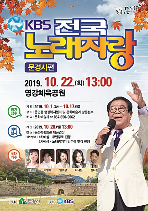 국민 MC 송해 선생이 진행하는 ‘KBS 전국노래자랑’은 문경시민 남녀노소 누구나 참가 가능하며, 참가 희망자는 10월 1일부터 17일까지 읍·면·동 행정복지센터 또는 문화예술과에 직접 방문하여 참가 신청서를 접수하면 된다.