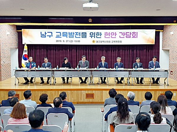 대구광역시의회 교육위원회(위원장 박우근)는 지난 9월 27일 오후 3시 대구영선초등학교 시청각실에서 남구 지역 32개교 학교장, 학교운영위원 및 학부모 등을 초청해 현장의 목소리를 청취하고, 교육현안 문제 해결 및 의정활동 반영을 위한 간담회를 개최했다.