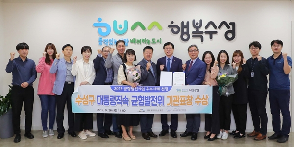 수성구(구청장 김대권)는 대통령직속 국가균형발전위원회가 주관하는 ‘2019 균형발전사업 우수사례 평가’에서 전국 69개 자치구 중 유일하게 기관표창을 수상했다.