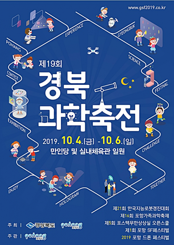 경상북도는 경북의 첨단과학기술을 한눈에 보고, 느끼고 체험할 수 있는 ‘제19회 경북과학축전’을 10월 4일 ~ 6일까지 3일간 포항 만인당 및 실내체육관 일원에서 개최한다.