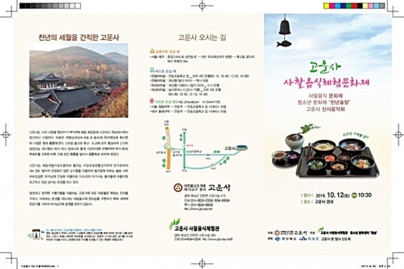 고운사가 주관하고 경상북도·의성군(군수 김주수)이 후원하는 ‘2019 고운사 사찰음식 체험문화제’가 오는 10월 12일, 10시 30분부터 의성군 고운사 경내에서 열린다.