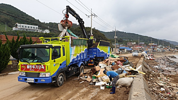 영덕군은 침수피해지역에서 정리를 끝내고 배출한 쓰레기를 집중 수거하며 생활쓰레기 처리에 힘쓰고 있다.