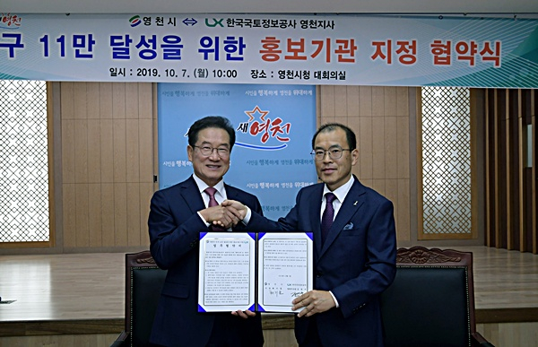 영천시(시장 최기문)는 지난 10월 7일 시청 대회의실에서 한국국토정보공사(LX) 영천지사(지사장 김경수)와 영천인구 11만 달성을 위한 홍보기관 지정 협약을 체결했다.