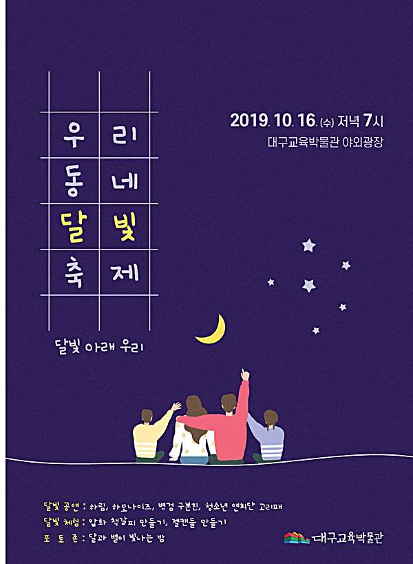 대구교육박물관(관장 김정학)은 10월 16일 저녁 7시 대구교육박물관 야외 특설무대에서 ‘2019년 우리동네 달빛축제’를 개최해 깊어가는 10월의 가을 밤을 짙은 감성으로 수놓을 예정이다.