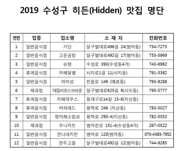 | ↑↑ '수성구 히든맛집' 지정 명단 |