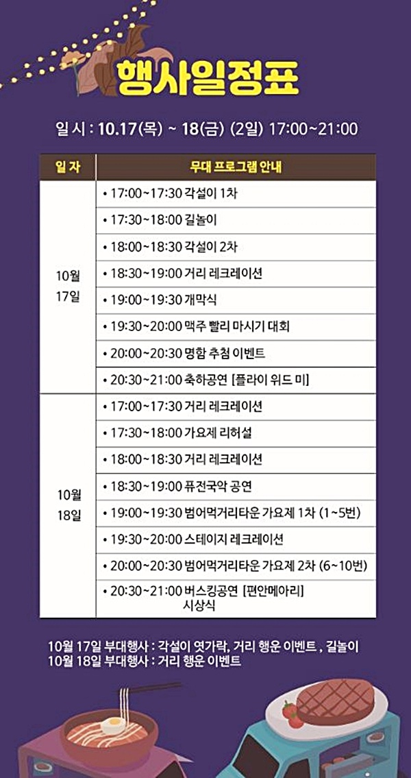 이번 행사에는 총 300만원 상당의 이용권 및 총 900만원 상당의 무료시식권 추첨과 함께 거리공연(길놀이, 각설이, 퓨전국악공연), 버스킹 공연, 맥주 빨리마시기 대회, 가요제 등 고객들에게 볼거리, 즐길거리도 함께 제공한다.