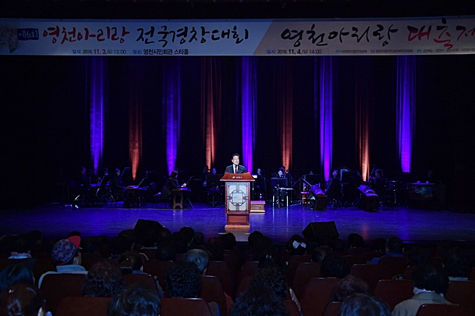 (사)영천아리랑연구보존회((회장 전은석)는 4일 영천시민회관에서 영천아리랑대축제를 열어 전날 실시한 ‘제6회 영천아리랑전국경창대회’ 시상식을 가졌다. 이날 행사에는 최기문 영천시장, 이만희 국회의원, 박종운 시의회의장, 도·시의원, 시민, 참가자 등이 함께해 영천아리랑대축제를 즐겼다.