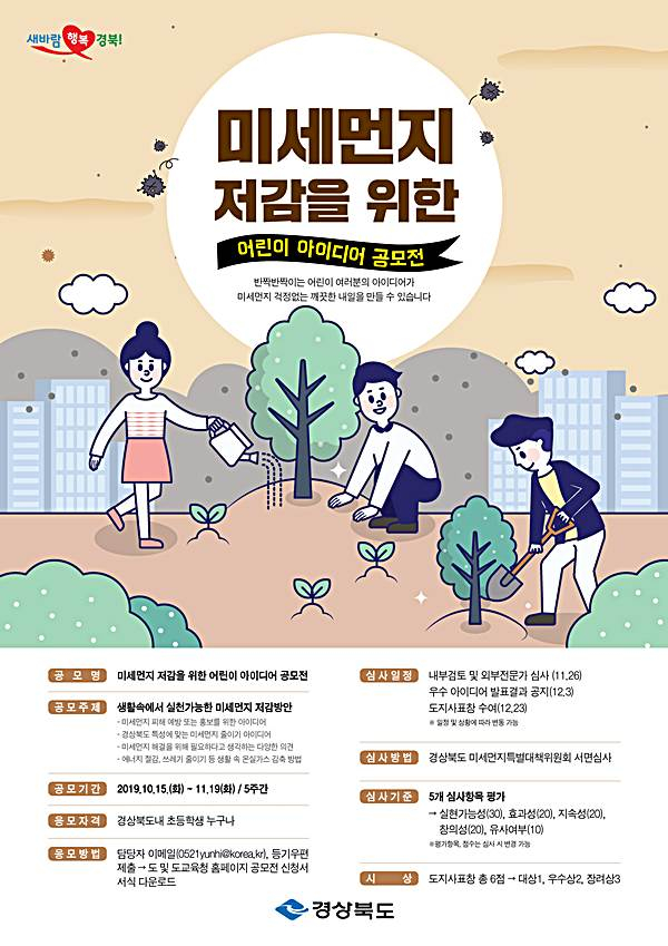 경상북도는 생활 속 미세먼지 저감을 위해 10월 15일부터 다음달 19까지 아이디어를 공모한다고 밝혔다.