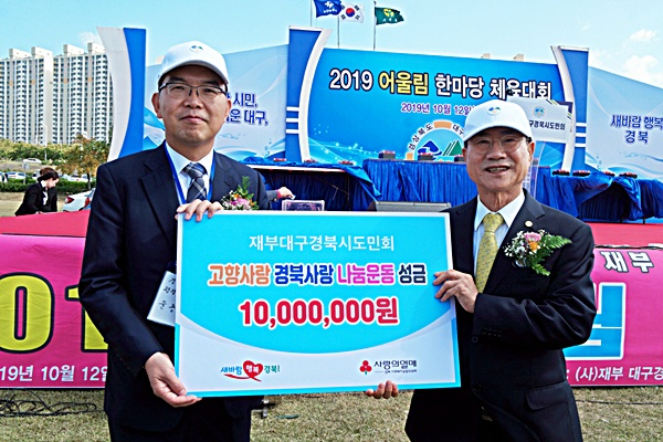 재부대구경북시도민회(회장 우방우)는 지난 10월 12일 부산 삼락생태공원에서 개최된 ‘2019 어울림 한마당 체육대회’에서 ‘고향사랑 경북사랑 나눔운동’ 일환으로 경북사회복지공동모금회(회장 신현수)에 1000만 원을 기부했다고 밝혔다.