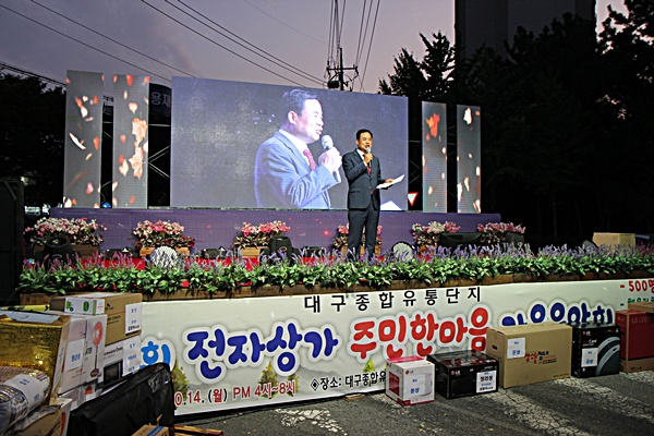 특히 이날 최무근 본부장은 “전자상가의 발전을 위하여 대구시와, 중소기업청 그리고 지역주민께서 많은 관심과 노력을 기울여 주심에 감사를 드리며, 앞으로도 계속 산격동 유통단지의 발전에 최선을 다하겠다”고 했으며 주민과 상인600여명에게 무료급식행사와 더불어 중앙가수 박구윤과 지방가수들의 음악속에서 이웃들과 소통을 하면서 깊어가는 가을밤에 잊지 못할 추억을 되새겼다.