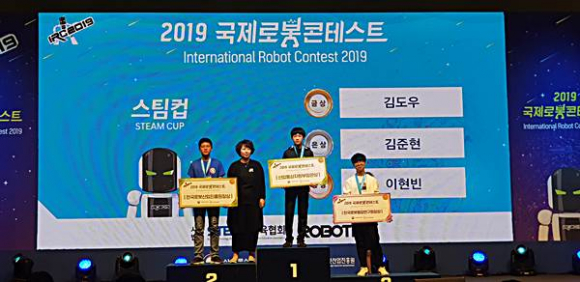 김도우 학생은 2019국제로봇콘테스트(IRC) ‘스팀컵’ 대구 예선대회 에서 금상을 수상하여 본선에 진출, 지난 10일(목) 펼쳐진 본선대회 스팀컵 자율형보행 부문에서 중·고등부를 통틀어 수상하는 영예를 안게 되었다.
