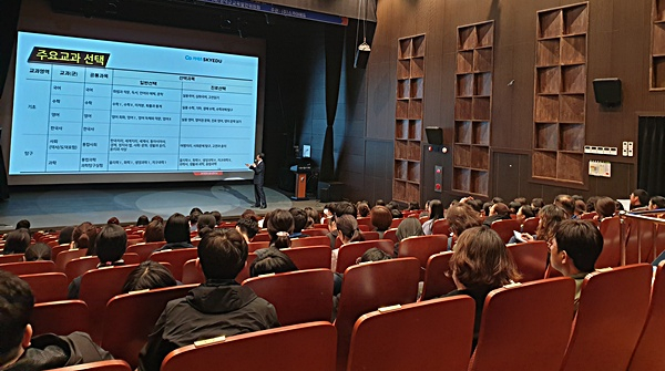㈜스카이에듀 오성균 본부장이 2023학년도 이후 변화되는 대학입시 전망을 소개하고, 이에 따른 효과적인 준비 전략을 제시해 학부모의 큰 호응을 얻었다. 특히 수능시험 개편안 영역별 포인트와 주요 대학 반영방법에 대한 심도 있는 설명이 있었다.