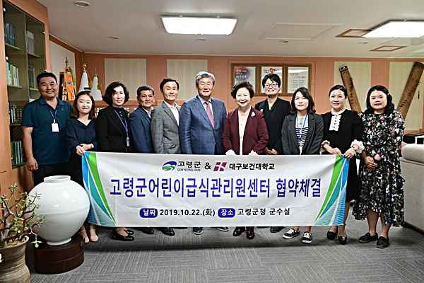 고령군(군수 곽용환)은 지난 10월 22일 군수실에서 대구보건대학교 남성희 총장을 비롯한 관계자 등이 참석한 가운데 ‘고령군 어린이급식관리지원센터’ 협약식을 가졌다.