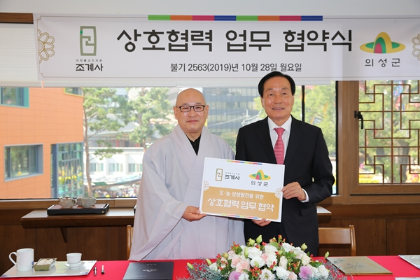 의성군은 28일, 서울 조계사에서 김주수 의성군수와 조계사 주지 지현스님을 비롯한 관계자들이 참석한 가운데 대한불교조계종 조계사와 ‘상생발전을 위한 업무협약(MOU)’을 체결했다.