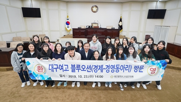 대구여고 ‘블루오션’(경제ㆍ경영 동아리) 학생들은 지난 23일 수성구의회(의장 김희섭)를 방문해 의회 시설을 견학하고 평소 가지고 있던 수성구 정책, 예산 등에 대한 궁금증을 해소하는 자리를 가졌다.․