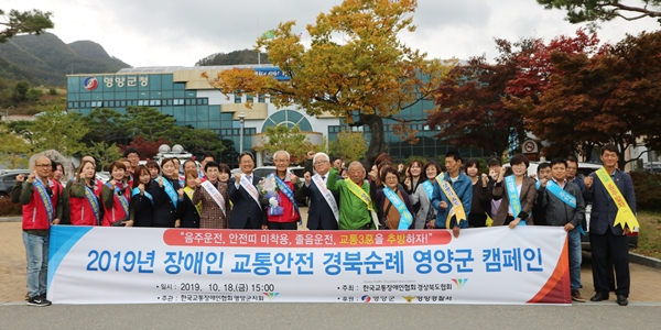 한국교통장애인경북협회 주관으로 한국교통장애인협회 영양군지회에서는 10월 18일 ‘2019 장애인 교통안전 경북순례 영양군캠페인’을 영양군청에서 출발해 영양경찰서앞까지 교통안전 카퍼레이들 실시하여 고통사고의 가장 큰 원인이 되는 ‘음주운전, 안전띠 미착용, 졸음운전, 교통 3악을 추방하자!’라는 주제로 ‘교통사고 예방캠페인’을 실시했다.
